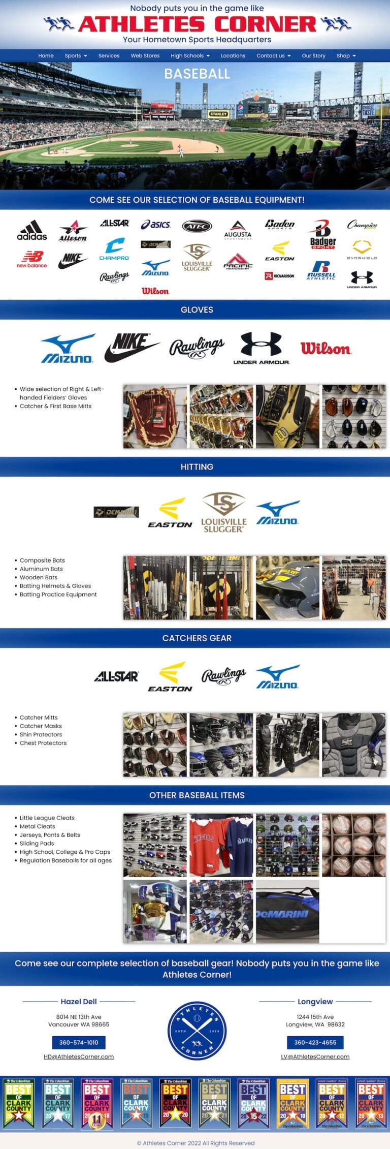 A secondary pages, broken down by sport, show customers the vast array of products Athletes Corner has on hand.