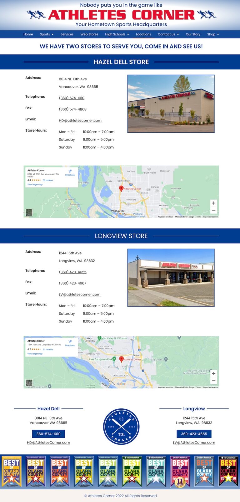 The hero photo of their homepage is of their headquarters/store, but both of their stores are displayed in the footer of the entire site.